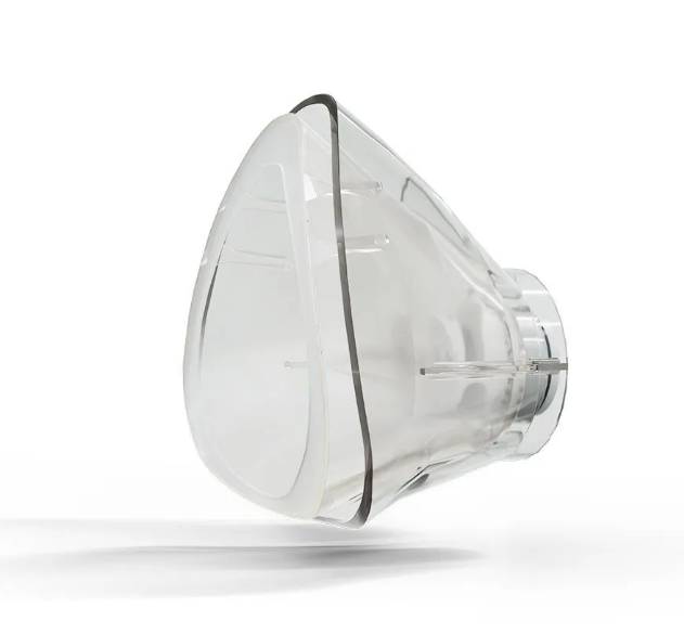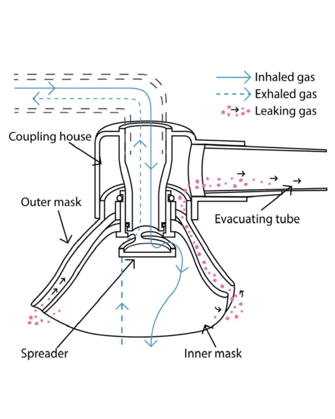 Die einzigartige Double Mask besteht aus einer weichen Innenmaske aus transparentem Silikon und einer stabilen Außenmaske aus transparentem Polysulfon. Zwischen beiden Masken befindet sich ein Zwischenraum, über den austretende Gase gezielt abgesaugt werden.