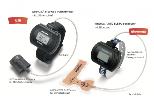 Abhängig vom gewünschten Datendownload und der Anwendung ist das WristOx2® 3150 in verschiedenen Ausführungen verfügbar. Das USB-Modell unterstützt das Herunterladen von Daten per USB-Verbindung, das BLE-Modell die Übertragung von Daten per Bluetooth Low Energy.